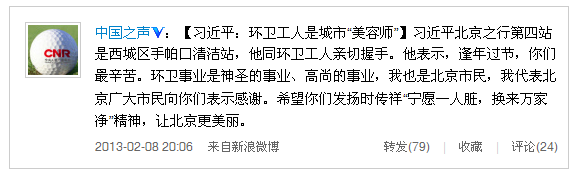 他表示,逢年過(guò)節(jié),你們最辛苦。環(huán)衛(wèi)事業(yè)是神圣事業(yè)、高尚事業(yè),我也是北京市民,我代表北京廣大市民向你們表示感謝。希望你們發(fā)揚(yáng)時(shí)傳祥“寧愿一人臟,換來(lái)萬(wàn)家凈”精神,讓北京更美麗。