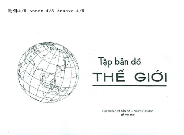 1972年5月越南總理府測量和繪圖局印制的《世界地圖集》,用中國名稱標(biāo)注西沙群島(見附件4)。1974年越南教育出版社出版的普通學(xué)校九年級《地理》教科書,在《中華人民共和國》一課(見附件5)中寫道:“從南沙、西沙各島到海南島、臺灣島、澎湖列島、舟山群島,……這些島呈弓形狀,構(gòu)成了保衛(wèi)中國大陸的一座‘長城’?!?/p>