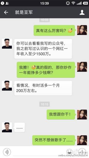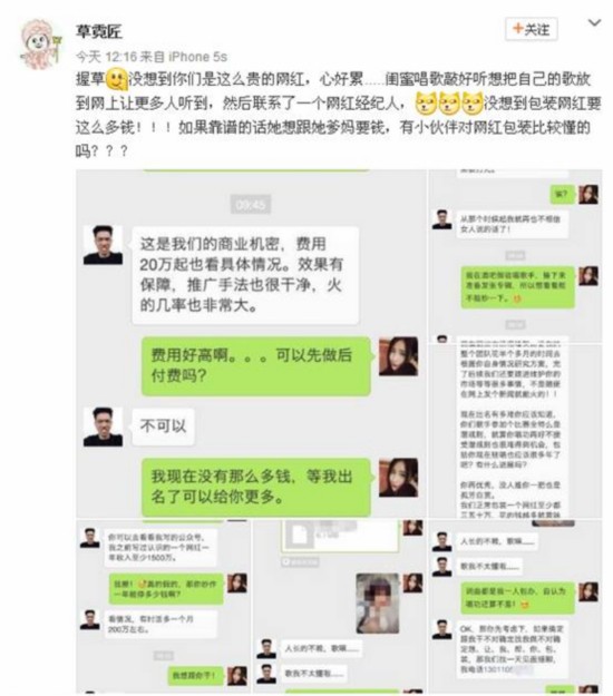 6月6日,某酒吧駐唱女歌手通過自己的微博發(fā)布了幾張聊天截圖。截圖內(nèi)容也是著實讓大家大吃一驚。聊天內(nèi)容大意是酒吧駐唱女歌手找了一位可以網(wǎng)紅經(jīng)紀人,期望他能夠把自己炒成網(wǎng)絡紅人,而每次推成功一次紅人,大概費用至少是20萬起。該網(wǎng)紅經(jīng)理自稱打造網(wǎng)紅每月收入百萬。