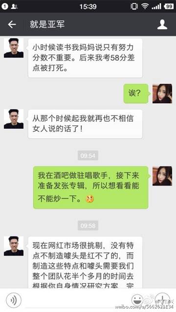 6月6日,某酒吧駐唱女歌手通過自己的微博發(fā)布了幾張聊天截圖。聊天內(nèi)容大意是酒吧駐唱女歌手找了一位可以網(wǎng)紅經(jīng)紀人,期望他能夠把自己炒成網(wǎng)絡紅人,而每次推成功一次紅人,大概費用至少是20萬起。