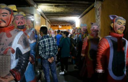 兵馬俑彩繪工藝復(fù)雜、上色講究,但是在這個(gè)八大奇跡館里面,兵馬俑模型統(tǒng)統(tǒng)被化成了“雙眼皮、紅嘴唇”。