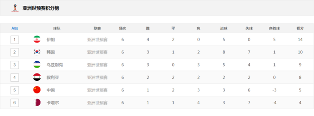 雖然第6輪不敵國足,但韓國仍然手握10分,未來4輪分別對陣敘利亞(主)、卡塔爾(客)、伊朗(主)、烏茲別克斯坦(客)。除了面對“克星”伊朗沒有把握外,其他都是韓國隊搶分的機會,想超越韓國拿到小組第2,需要比韓國隊多拿到5分,希望并不大。