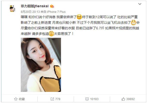 8月20,雪莉在小號微博@“菲力姐姐jfiensksl ”公布懷孕:“嘿嘿,和你們說個好消息,我要做媽媽了,終于熬到12周可以說了,吐的比較嚴重,影響了之前上新進度,月底也只能小新,不過下個月我就可以坐飛機出去拍了。會盡量給你們保質保量帶來好看的衣服,目前已經(jīng)胖了6.7斤,如果照片視頻里的我越來越胖,請多多包涵,太容易餓了! ”
