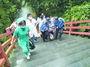 盧先生繼續(xù)攙扶著妻子往山下走。當(dāng)他們走到離山腳還有900米時(shí),遇到了兩名前來施救的輔警,兩人在兩名輔警的攙扶下,繼續(xù)慢慢向山下走去。走到離山腳約600米距離時(shí),120急救人員、景區(qū)工作人員及兩名輔警也趕來了。醫(yī)護(hù)人員對他們進(jìn)行了檢查和包扎后把王女士抬上擔(dān)架。王女士一邊輸液一邊被抬下山。40分鐘后,終于到達(dá)山下,王女士被送往醫(yī)院救治。