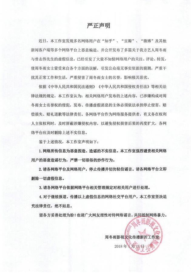 網(wǎng)易娛樂(lè)1月11日?qǐng)?bào)道 近日有傳聞周冬雨曾志偉關(guān)系親密,并因此獲得影視資源。對(duì)于此傳聞,周冬雨工作室今天中午發(fā)布聲明否認(rèn)此傳聞,稱此傳聞嚴(yán)重侵害周冬雨名譽(yù),影響極其惡劣。同時(shí)表示強(qiáng)烈譴責(zé)惡意造謠行為,希望廣大網(wǎng)友理性對(duì)待網(wǎng)絡(luò)謠言,共同抵制網(wǎng)絡(luò)暴力。