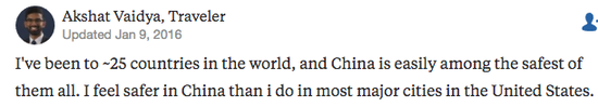 當然,在中國旅游對老外的吸引力不只是便捷。一位去過全世界二十多個國家的外國驢友總結(jié)說,“中國是我去過的最安全的國家之一。我感覺在中國的大型城市比在美國安全多了?!?/p>