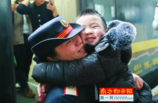 2月10日16時57分,深圳開往烏魯木齊的Z 230次列車??亢怅栒?,由知名導演陳可辛執(zhí)導的短片《三分鐘》原型列車員劉鐘與兒子丁丁在站臺短暫相聚三分鐘。緊緊的相擁后告別在即,劉鐘眼中含淚,她還要上班至15日。不過,讓劉鐘特別開心的是今年她終于可以回家過除夕,這是11年來第一次。 南都記者 馬強 攝