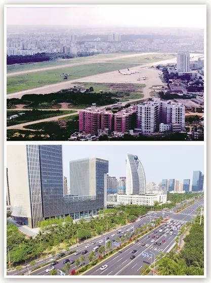 拼版照片為??谑袊d大道,曾經(jīng)是??诖笥⑸綑C(jī)場(chǎng)(上圖為1999年5月新華社記者姜恩宇攝,下圖為2018年4月14日新華社記者郭程攝)。 新華社發(fā)