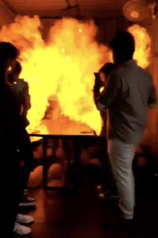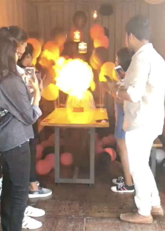 視頻剛開始的畫面是女孩準(zhǔn)備點(diǎn)燃生日蛋糕上的蠟燭,她的朋友們紛紛簇?fù)砩蟻恚檬謾C(jī)拍照,想要為她記錄這幸福的一刻。畫面中,女孩身穿一件灰藍(lán)色連衣裙,左臂內(nèi)側(cè)紋著一枚與眾不同的紋身圖案,四周被數(shù)十個粉色以及黑色的氫氣球圍繞著,接下來她劃了一根火柴,點(diǎn)燃了生日蛋糕上的蠟燭準(zhǔn)備許愿,緊接著,附近的氫氣球就突然發(fā)生了爆炸。房間里瞬間升起了巨大的火球,女孩也被火焰圍繞,她和朋友們都嚇得尖叫了起來。