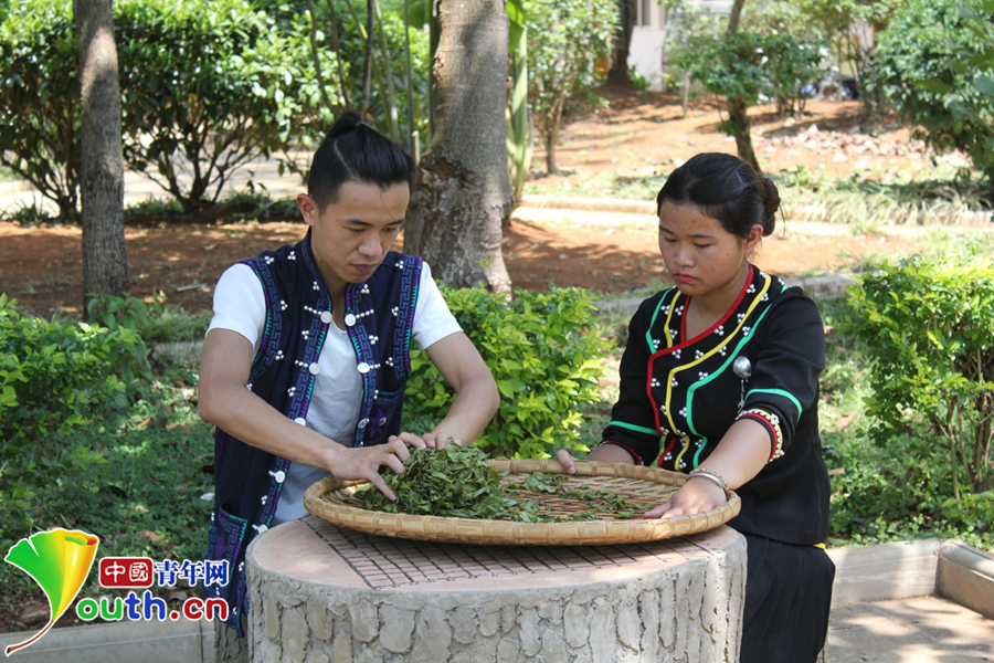 正在揉茶的李明澤(左)。
