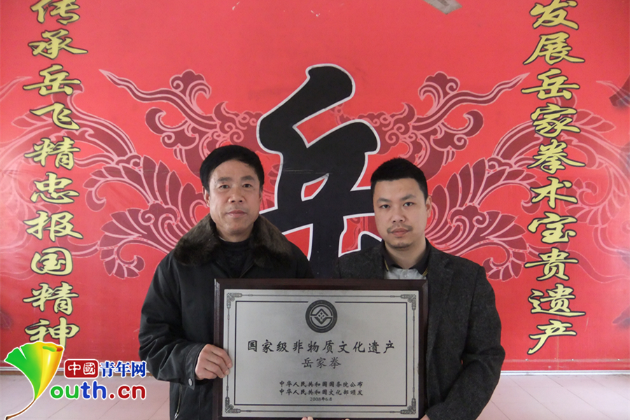2008年,岳家拳正式被國務(wù)院批準(zhǔn)為國家級非物質(zhì)文化遺產(chǎn)。張業(yè)金(左)與張奇鋼(右)從北京捧回岳家拳非遺匾。
