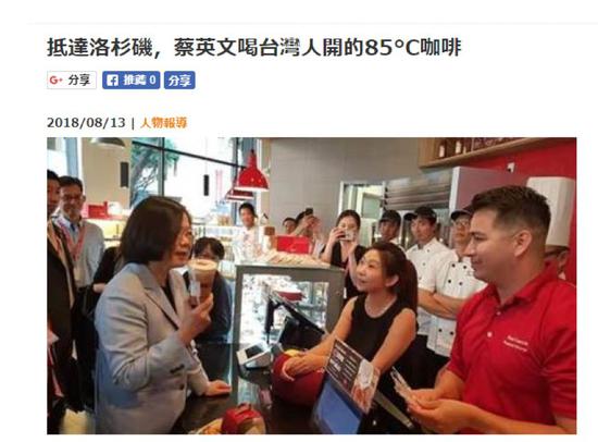 然而,令這家在大陸賺錢賺得“美滋滋”的臺灣企業(yè)意外的是,公司在美國洛杉磯的一家店鋪,卻成了在美國洛杉磯“過境”和給臺獨“造勢”的蔡英文專門“造訪”的一站。而且根據(jù)臺灣媒體的報道,這蔡英文還把“85度C”視為“臺灣之光”。