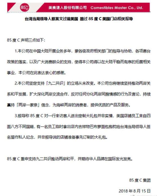 目前,針對蔡英文“訪問”其美國店面而引起了強烈輿論風(fēng)波,“85度C”剛剛在其開設(shè)在大陸微博和微信平臺的賬號上發(fā)布了一則聲明,強調(diào)其支持“九二共識”和“反對任何分化兩岸同胞情感的行為及言論”。