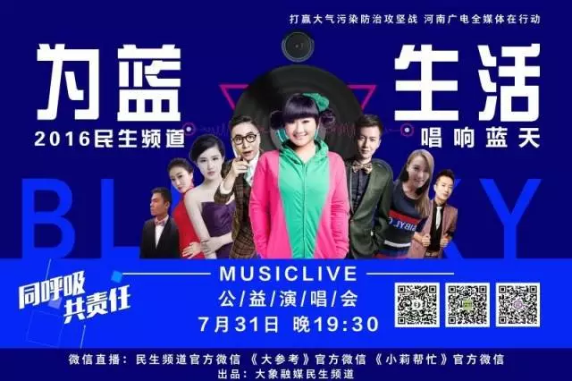 同呼吸,共責(zé)任,打贏大氣污染防治攻堅戰(zhàn),河南廣電全媒體在行動,為藍(lán)生活唱響藍(lán)天,2016民生頻道MUSIC LIVE公益演唱會7月31日晚19:30,喚醒你的雙耳,等你來聽……