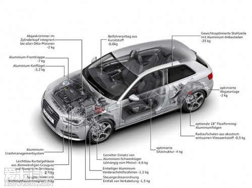 “輕量化”之于奧迪,已然成為品牌精髓所在,截止2011年已有70萬輛裝備了AFS輕質(zhì)車架的奧迪汽車駛下生產(chǎn)線。全新一代奧迪A3相比老款的減重達(dá)到了80千克,首當(dāng)其沖的就是采用了復(fù)合材料車架,車架型材包括了奧迪擁有自主知識產(chǎn)權(quán)的:超硬鋼、先進(jìn)高強度鋼、高強度鋼、低碳鋼以及鋁板。這些不同材料通過多種連接方式構(gòu)成了強度大幅提升的車身,同時重量下降了18千克。而大眾集團(tuán)最新的“MQB”橫置發(fā)動機模塊化平臺則能夠幫助奧迪A3進(jìn)一步減輕重量,比如A3使用的前輪鋁制副車架就帶來了6千克的減重效果。