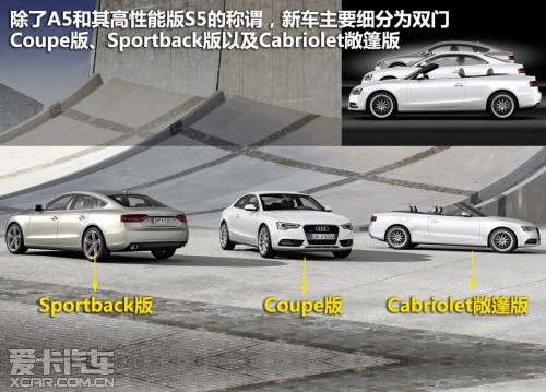 車型方面,2012款車型除了A5和其高性能版S5的稱謂,新車主要細分為雙門Coupe版、Sportback版以及Cabriolet敞篷版。據悉,此次國內曝光的測試車輛是雙門Coupe版。