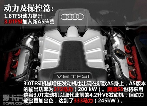 入門級的奧迪A5將采用1.8TFSI發(fā)動機,重新調教后,動力輸出從158馬力提高到168馬力。2.0 TFSI發(fā)動機的動力輸出依舊為211馬力(155kW)。3.0TFSI機械增壓發(fā)動機也出現(xiàn)在新款A5身上,A5版本的輸出功率為272馬力(200 kW)。奧迪S5也將采用這臺3.0T發(fā)動機以取代此前的4.2升V8發(fā)動機,但動力輸出更加出色,達到了333馬力(245kW)。變速箱方面,與以上幾款發(fā)動機匹配的將有6速手動、無級變速器、7速S tronic三種。