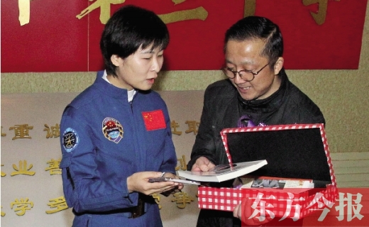 禮品一一打開(kāi),劉洋臉上的表情,除了驚喜還是驚喜:代表“問(wèn)鼎蒼穹”的司母戊鼎,印有飛天字樣的青花瓷盤(pán)和唐三彩的馬,還有一本由東方今報(bào)記者為劉洋而編著的書(shū)《飛天嫦娥劉洋》。