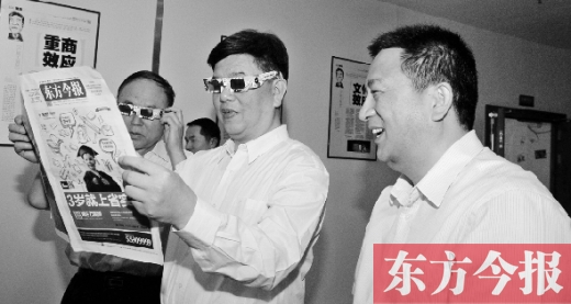 童剛副局長十分關心東方今報的發(fā)展,向東方今報社社長趙國平詳細詢問了解報社的新聞宣傳、廣告經(jīng)營、發(fā)行情況以及員工待遇,得知東方今報全省發(fā)行覆蓋、全媒體聯(lián)動運營并在河南率先發(fā)行出版3D版報紙時,童剛副局長在調研現(xiàn)場興趣盎然地戴上3D眼鏡體驗,并贊揚東方今報的創(chuàng)新走到了前列。