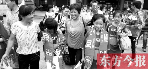 昨天下午3點,在新鄭國際機場大廳等待已久的隊員家長們,終于迎來臨潁縣女子足球隊的小隊員們。當(dāng)家長們看見隊員從大廳里整齊走出來,都圍了上去,紛紛念叨著“瘦了,黑了”。李女士說,大約有7名小隊員的家長來鄭州接機,幾乎所有的孩子河南省都沒出過。隨后,小隊員和家長們陸續(xù)坐上了趕往河南建業(yè)球場的大巴。