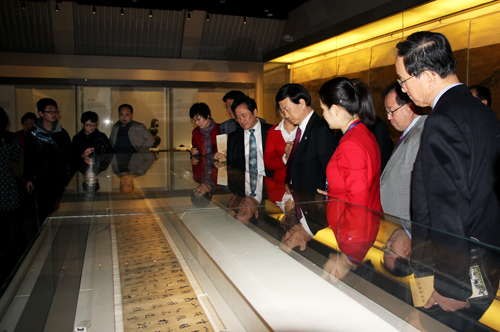 韓國(guó)文化交流團(tuán)成員認(rèn)真觀看展品