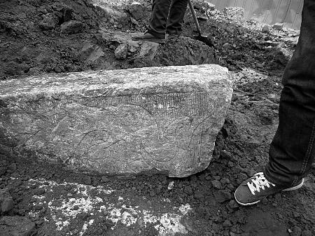 昨日上午,記者來到發(fā)現(xiàn)古墓的施工現(xiàn)場,南陽市文物考古研究所考古人員已經(jīng)進(jìn)駐該工地,著手發(fā)掘工作。這座古墓位于該市臥龍路與車站路交叉口南側(cè)約700米處,4塊大小不一、形狀各異的大青石散落在工地中央,其中兩塊仍半掩在泥土中,依稀能看到上面刻有圖案(如圖),現(xiàn)場還有不少灰色磚塊。