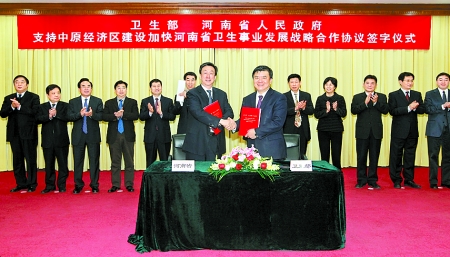 河南日報訊 (記者屈 芳)河南衛(wèi)生事業(yè)迎來加快發(fā)展的新機(jī)遇。3月21日下午,衛(wèi)生部與河南省人民政府關(guān)于支持中原經(jīng)濟(jì)區(qū)建設(shè)加快河南省衛(wèi)生事業(yè)發(fā)展戰(zhàn)略合作協(xié)議簽字儀式在北京舉行,衛(wèi)生部部長陳竺,省委副書記、省長郭庚茂在簽字儀式上講話并代表雙方在合作協(xié)議上簽字。