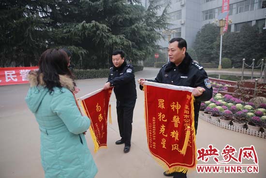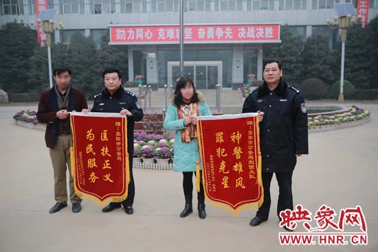 映象網(wǎng)訊(記者 王文凱 通訊員 牛智瑞 薛勇)滎陽(yáng)17歲男孩盧健(化名)在被困傳銷窩點(diǎn)21天后,滎陽(yáng)警方跨省將其營(yíng)救。20日上午8時(shí)許,心存感激的孩子父母及親屬敲鑼打鼓來(lái)到滎陽(yáng)市公安局,把“匡扶正義,為民服務(wù)”“神警雄風(fēng),罪犯克星”,兩面錦旗贈(zèng)給公安局,局長(zhǎng)夏日紅和政治部主任楚宏偉親自從家屬手中接過(guò)兩面錦旗。無(wú)法表達(dá)內(nèi)心感激之情的盧女士拿出兩萬(wàn)元現(xiàn)金要對(duì)專案組民警表示謝意,遭到夏日紅局長(zhǎng)拒絕。