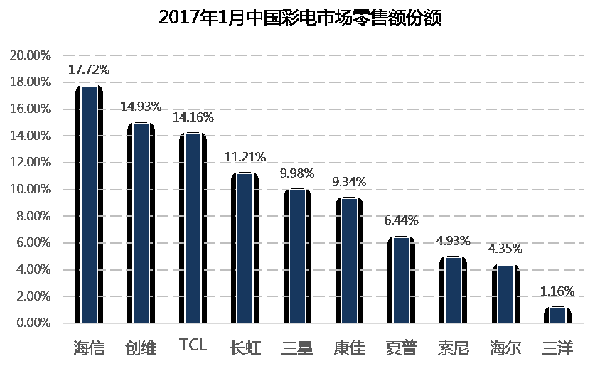 根據(jù)中怡康最新發(fā)布的2017年1月份月報(bào)統(tǒng)計(jì)數(shù)據(jù),海信電視零售量、零售額占有率分別達(dá)到16.7%和17.7%,雙雙高居中國彩電市場銷售量和銷售額占有率的第一位,其中銷售額占有率超出第二名2.79個(gè)百分點(diǎn).