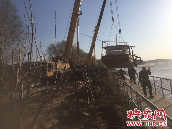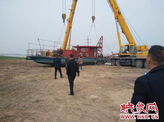 3月1日,執(zhí)法人員又來到汜水鎮(zhèn)趙村沙場岸邊,對(duì)一艘重達(dá)50噸的非法采砂船進(jìn)行起吊離上岸。