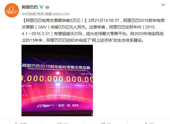 阿里巴巴3月21日宣布,截至3月21日14:58:37,阿里巴巴2016財(cái)年電商交易額(GMV)突破3萬億元人民幣。這意味著,阿里巴巴在財(cái)年內(nèi)(2015.4.1-2016.3.31)有望超越沃爾瑪,成為全球最大零售平臺(tái)。