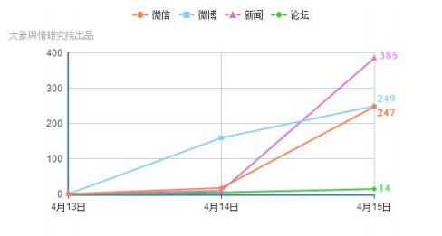 上圖可以看出,自4 月14 日辭職信流傳開來,網(wǎng)絡關注度持續(xù) 攀升。其中,微博關注度始終處于較高態(tài)勢,成為此事件的傳播主場。