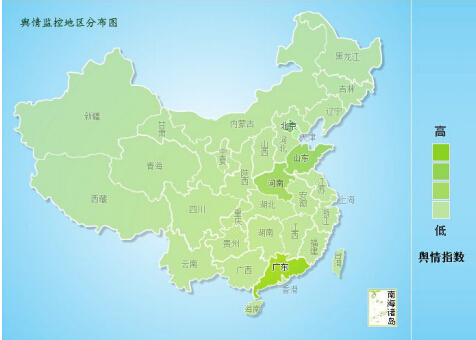 下圖為輿情監(jiān)控地區(qū)分布圖,大象輿情研究院通過對此事件相關報道網(wǎng)站ICP監(jiān)管所屬地區(qū)的挖掘分析,廣東媒體的傳播活躍度最高,這與廣東地區(qū)歷來開風氣之先、敢作敢為的特征相吻合;其次是 北京、山東、河南的媒體。