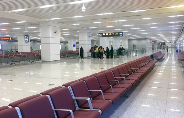 鄭機城鐵機場站候車大廳,空蕩的大廳內只有少數(shù)乘客