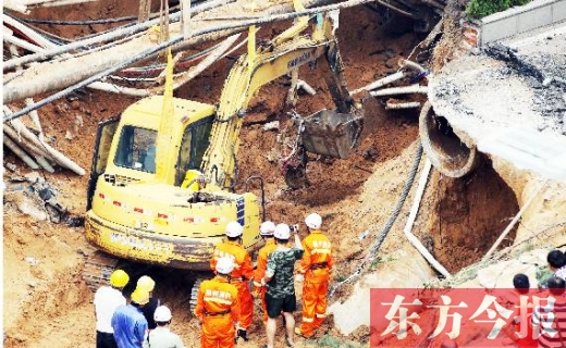 塌方發(fā)生時(shí),一男一女被民警和熱心市民救出。目擊者稱,坑中仍有一名女士和小孩,但警方經(jīng)過排查,除了名叫張帆的女士,尚未發(fā)現(xiàn)有人員失蹤。今報(bào)三批記者輪班蹲守現(xiàn)場,截至3日2時(shí),救援在經(jīng)歷了近30個(gè)小時(shí)后,尚未找到張帆。□東方今報(bào)記者 夏萍 見習(xí)記者 靳亞東 宋迎迎 攝影 首席記者 袁曉強(qiáng) 張曉冬 沈翔 邱琦