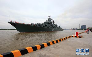 當日,參加中俄“海上聯(lián)合—2014”軍事演習的俄方艦艇陸續(xù)駛抵上海某軍港。中俄兩國海軍互鳴禮炮,中方為來訪的俄艦舉行隆重歡迎儀式。俄羅斯太平洋艦隊旗艦“瓦良格”號導彈巡洋艦駛入軍港時,參加歡迎儀式的軍樂隊奏響歡迎曲。隨后,“快速”號驅逐艦、“潘捷列耶夫海軍上將”號大型反潛艦、“伊利姆”號中型海洋油船、“涅維爾斯科伊海軍上將”號大型登陸艦,“卡拉爾”號海洋拖船陸續(xù)駛入港口。這次聯(lián)合軍事演習,中俄海軍都派出了主戰(zhàn)艦艇參加。中方參演兵力包括導彈驅逐艦、導彈護衛(wèi)艦、綜合補給艦以及導彈艇等水面艦艇8艘、潛艇2艘、固定翼飛機9架。俄方參演兵力包括巡洋艦、反潛艦、驅逐艦、登陸艦、油船和海洋拖船等水面艦艇6艘。此外,為執(zhí)行海上聯(lián)合解救被劫持船只、護航等特殊任務,雙方還派出艦載直升機、特戰(zhàn)分隊等兵力參加此次演習。新華社記者 查春明攝