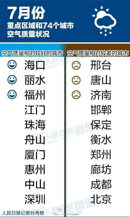 環(huán)保部今天發(fā)布7月城市空氣質(zhì)量狀況??諝赓|(zhì)量相對較差的后10位:邢臺、唐山、濟(jì)南、邯鄲、保定、衡水、鄭州、廊坊、成都和北京;空氣質(zhì)量相對較好的前10位:???、麗水、福州、江門、珠海、舟山、廈門、惠州、中山和深圳。