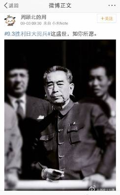讓人難忘的細(xì)節(jié)不僅僅在閱兵場(chǎng)上。3日上午9時(shí)30分,習(xí)近平主席偕夫人彭麗媛正在天安門迎候各國(guó)嘉賓,閱兵尚未正式開(kāi)始,會(huì)場(chǎng)內(nèi)外興奮期待的氛圍漸濃。就在此時(shí),網(wǎng)友“周顧北的周”發(fā)布了一條微博“這盛世,如你所愿”,配圖是一張周恩來(lái)總理的老照片。短短的七字微博引發(fā)了網(wǎng)友的強(qiáng)烈共鳴,轉(zhuǎn)發(fā)已過(guò)百萬(wàn)?!伴_(kāi)國(guó)大典的時(shí)候飛機(jī)不夠,周總理說(shuō)飛兩遍,現(xiàn)在再也不需要飛兩遍了,要多少有多少。山河猶在,國(guó)泰民安。當(dāng)年送你的十里長(zhǎng)安街,如今已是十里繁榮?!?/p>