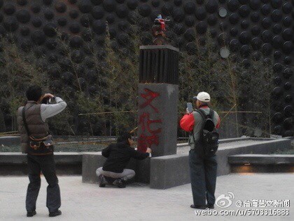 據(jù)臺(tái)媒報(bào)道,臺(tái)北“故宮”南院前天開幕試營運(yùn),成龍贈(zèng)送十二生肖獸首公共藝術(shù)給故宮。但有媒體報(bào)道是統(tǒng)戰(zhàn),今天傍晚4、5點(diǎn)有一男一女突然朝龍和馬獸首上倒紅漆,被人發(fā)現(xiàn)報(bào)警,目前警方已將兩人帶回嘉義縣太保分駐所偵訊中。