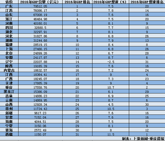 隨著2月19日海南省兩會(huì)開幕,地方兩會(huì)時(shí)間進(jìn)入尾聲,2016年各地GDP數(shù)據(jù)也已全部出爐。上游新聞-重慶晨報(bào)記者根據(jù)各地政府工作報(bào)告和統(tǒng)計(jì)部門數(shù)據(jù)發(fā)現(xiàn),GDP總量達(dá)到3萬億元以上的省份增至9個(gè)。