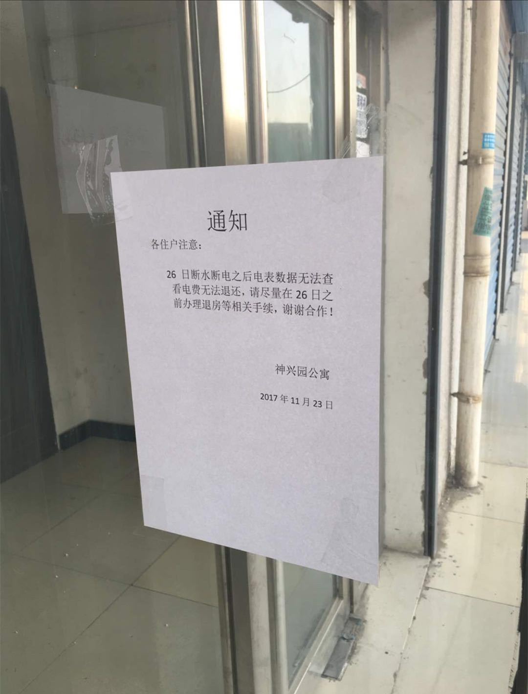 ?。ǜ鶕?jù)通州臺湖鎮(zhèn)政府下發(fā)的通知,亦園青年創(chuàng)業(yè)園周邊5家公寓應于11月26日全面停水停電,圖為5家公寓之一的神興園公寓的通知 饒賢君/攝)