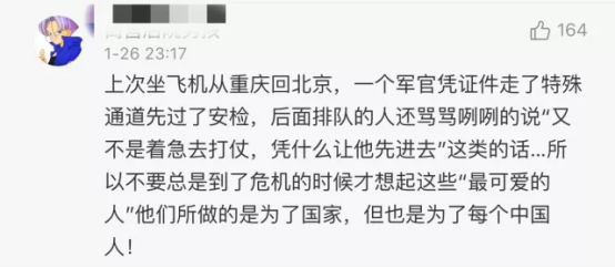 有網(wǎng)友就指出,在機(jī)場(chǎng)安檢口,一位軍人憑證件走軍人優(yōu)先窗口,卻有乘客罵罵咧咧地說:“又不是著急去打仗,憑什么讓他先進(jìn)去?”