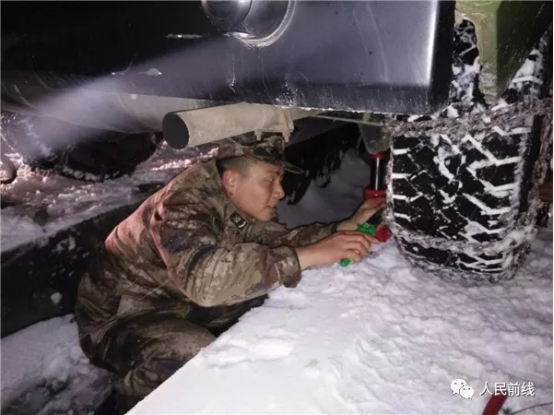 ▲第71集團(tuán)軍某合成旅迅速啟動(dòng)應(yīng)急方案,檢查并禁錮車輛防滑鏈。