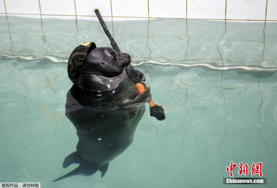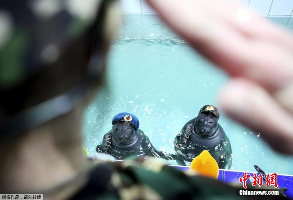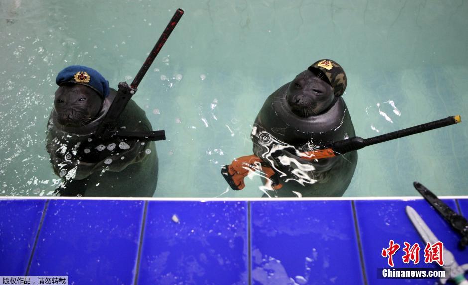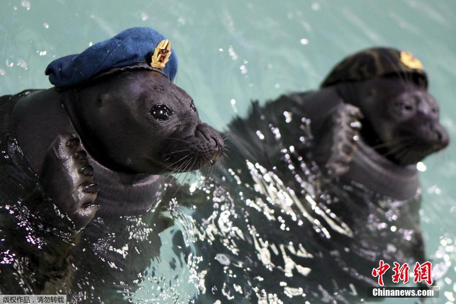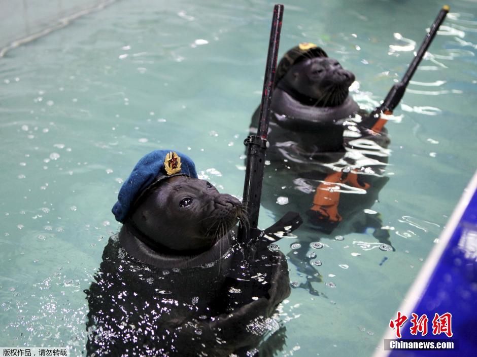 當(dāng)?shù)貢r(shí)間5月9日,莫斯科紅場(chǎng)舉行盛大閱兵式慶祝衛(wèi)國(guó)戰(zhàn)爭(zhēng)勝利70周年。在俄羅斯的伊爾庫(kù)茨克水上公園里,海豹們也身著“軍裝”認(rèn)真的在水中列隊(duì)接受訓(xùn)練員的檢閱。