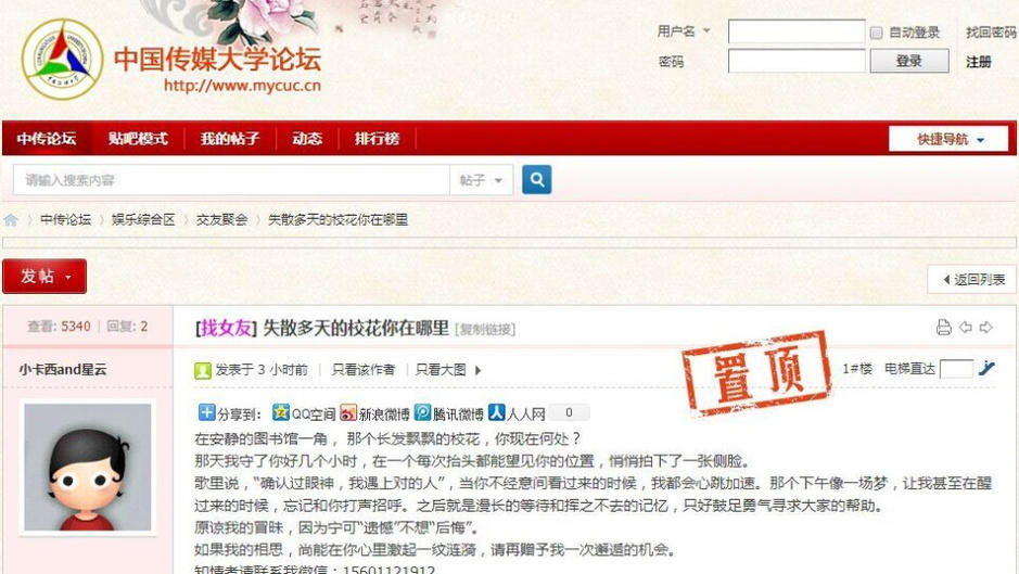 正值開學季,中國傳媒大學驚現(xiàn)癡情男,張貼了數(shù)百張海報只為表白?;?,據(jù)照片顯示,海報中有女孩側(cè)臉照片,還留下男生的聯(lián)絡(luò)方式,甚是精細。