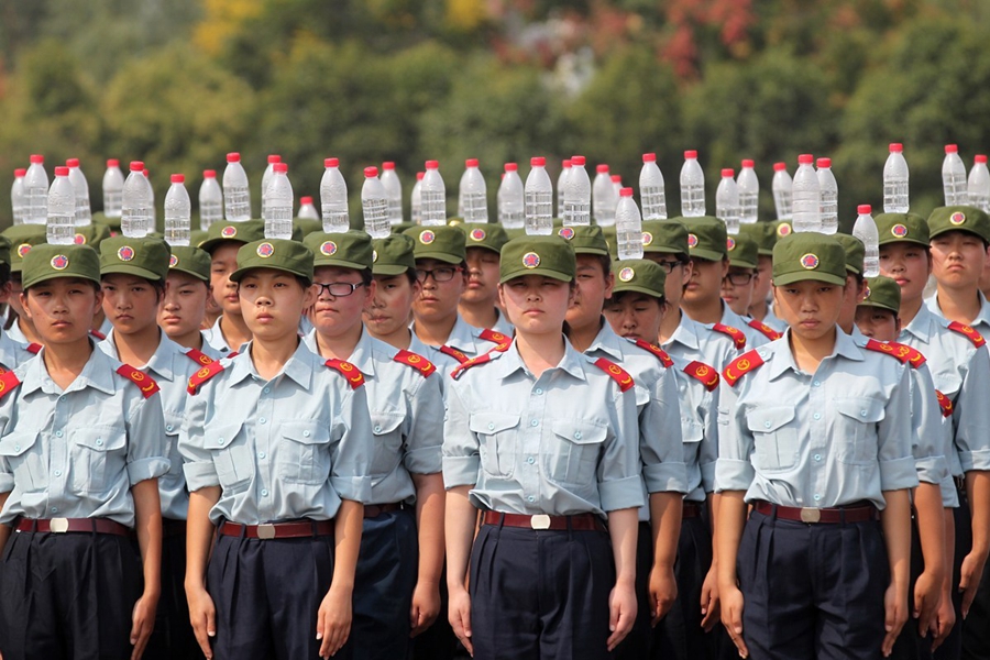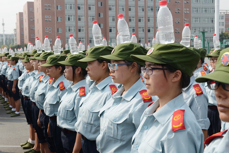 2015年9月17日,河南鄭州航空工業(yè)管理學(xué)院進(jìn)行新生軍訓(xùn),記者軍訓(xùn)現(xiàn)場(chǎng)發(fā)現(xiàn),該院在站軍姿、踢正步等軍訓(xùn)項(xiàng)目上,引入卷尺、純凈水瓶等“裝備”,而且為“準(zhǔn)空姐”訓(xùn)練的科目中,還增加了如何盤(pán)發(fā)等項(xiàng)目。圖為2015年9月17日,鄭州航空工業(yè)管理學(xué)院的新生在頭頂?shù)V泉水瓶站軍姿。