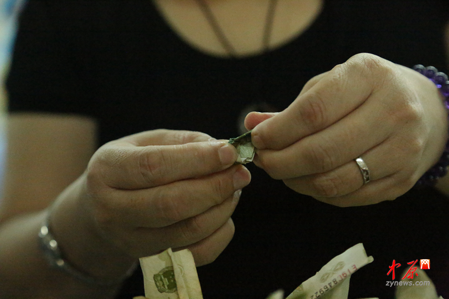 艾紅說(shuō),紙幣必須人工進(jìn)行清點(diǎn),因?yàn)檎劢?、打卷的非常多,只有手工清點(diǎn)才能完成這份工作。還有人惡作劇,將紙幣里包上碎玻璃,有一次點(diǎn)鈔員在清理時(shí),手指都被劃破了。