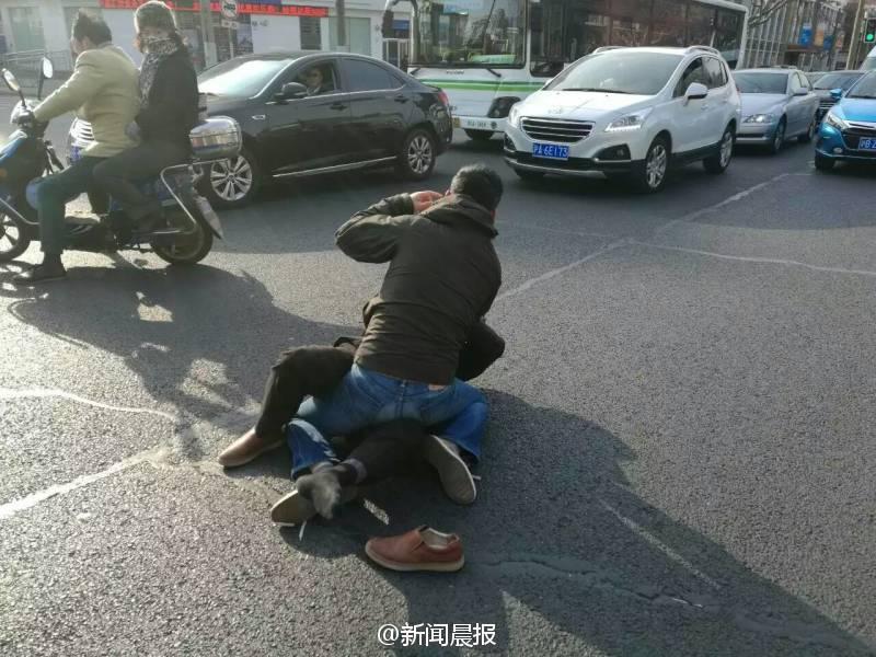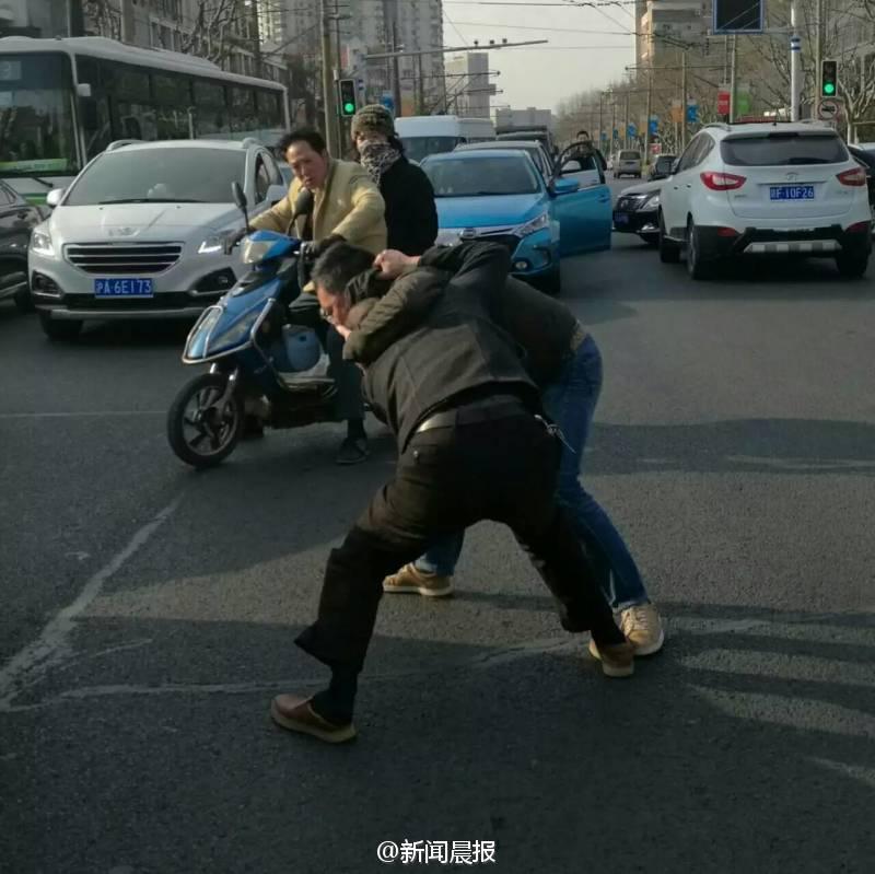 晨報訊 你一個過肩摔,我一個橫掃腿,接著扭打在一起,互相纏斗難分伯仲……這幕刺激的武打動作場景,昨天早高峰時在上海安波路營口路上演,而沖突竟源于“路怒”!目擊者肖先生告訴記者,昨天上午8點(diǎn)不到,他經(jīng)過安波路、營口路路口時,看看兩名男子扭打在一起,場面十分激烈?!拔翼槃菽贸鍪謾C(jī)拍了幾張照片,旁邊也有行人上去勸架?!毙は壬f,在兩名男子的身旁,一橫一豎停著兩輛轎車,“我想可能是兩個人開車有點(diǎn)摩擦引起的‘路怒’吧?!?/font>