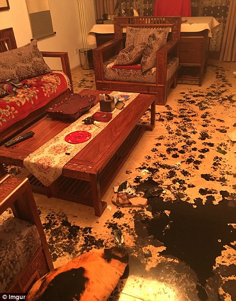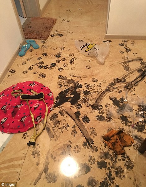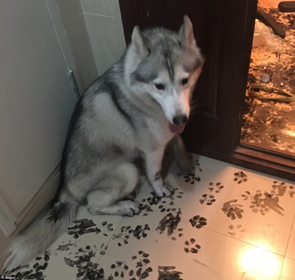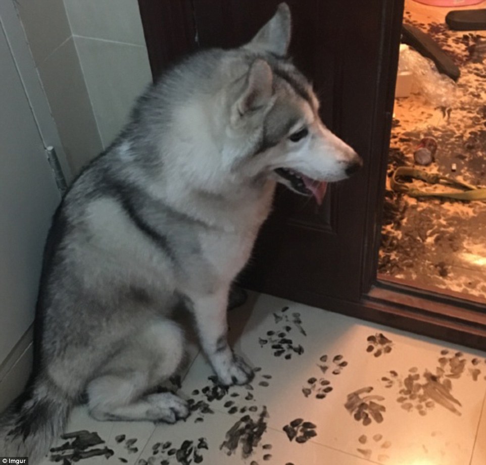 哈士奇或許在書房里翻到了主人練習書法用的墨汁并不小心打翻了,之后沒心沒肺的二哈踩著墨汁到處轉悠,房子的各個角落都留下了二哈烏黑的爪印。