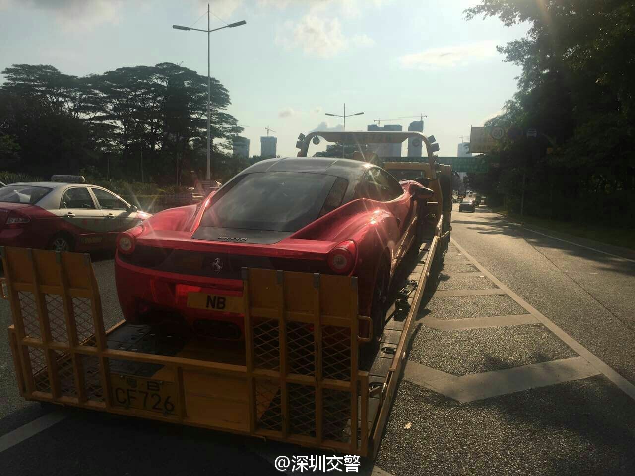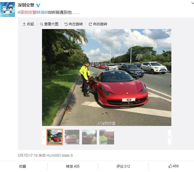 深圳交警5月7日17:16發(fā)布了一條微博:“當(dāng)鐵騎遇到他……”,同時(shí)配上四張圖片:只見(jiàn)一輛掛著“NB”車(chē)牌的紅色跑車(chē)被交警鐵騎攔下,最后被帶走。
